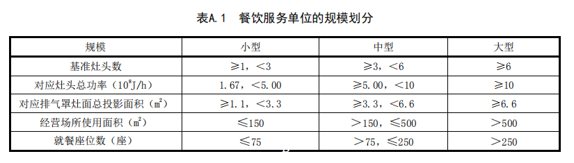 A.1 餐飲服務單位劃分為大型、中型和小型三個規模。基準灶頭數按灶的總發熱功率或排氣罩面投影